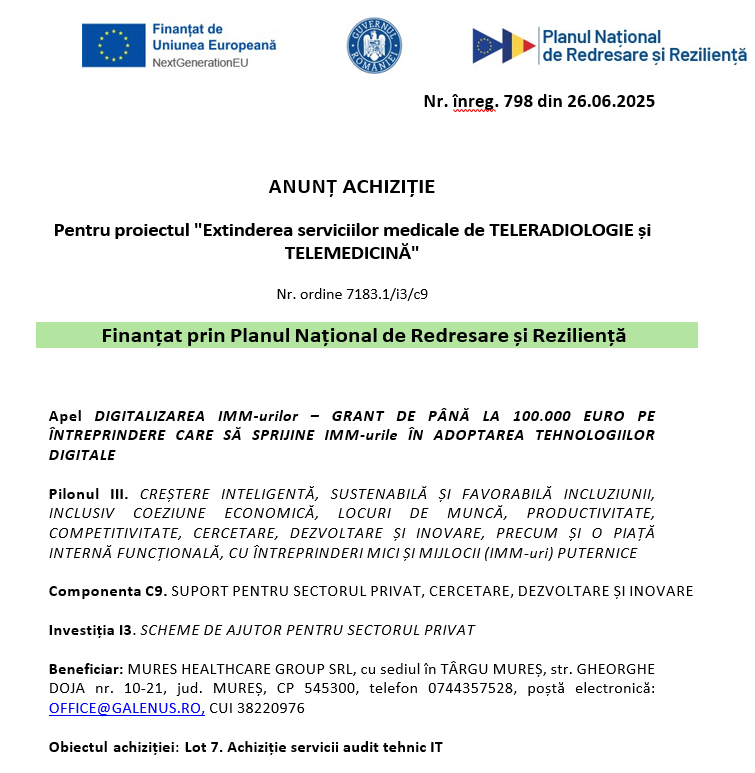 Beneficiar: MURES HEALTHCARE GROUP SRL, cu sediul în Târgu Mureș, str. Gheorghe Doja nr. 10-21,